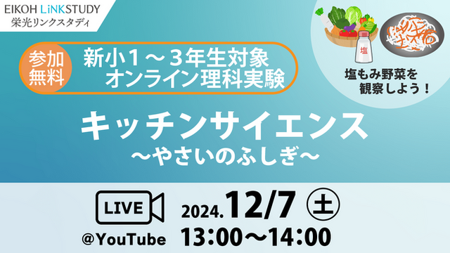 株式会社増進会ホールディングス(Z会グループ)のグループ会社、株式会社栄光(本社:東京都千代田区 代表取締役社長:下田勝昭)が運営するオンライン進学塾「EIKOH LiNKSTUDY(栄光リンクスタディ)」は、年長と小学1・2年生(新小学1・2・3年生)対象のオンライン理科実験教室「キッチンサイエンス~やさいのふしぎ~」を、2024年12月7日(土)13:00~14:00に無料開催します。