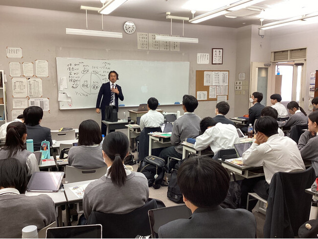 今回も高校2年生の2クラスに各1コマ(50分)ずつの授業を行いました。授業では「好きな事でお金を稼ぐ方法」、「起業の仕方」、「老後資金のための資産運用(NISA、iDeCo)」をテーマとして、お金を稼ぐことの意味や資産運用の大切さなど、高校生の金融リテラシー向上に役立つ内容をお話ししました。普段はなじみの薄い金融に関する講義だったこともあってか生徒の皆さんは真剣な様子で山口の講義に耳を傾けていました。また、iPadに電子ペンでメモを懸命に取っている姿もとても印象的でした。