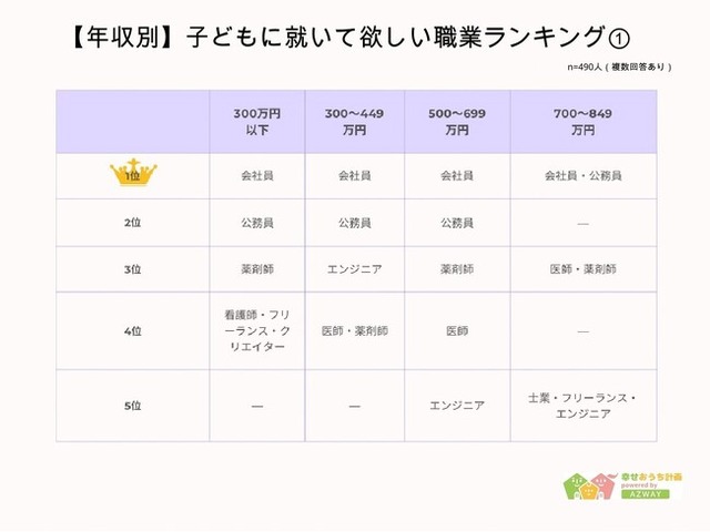 今回、株式会社AZWAY(https://azway.co.jp/)が運営する、幸せおうち計画(https://azway.co.jp/media/)は、10代から60代以上までの490人を対象に「子どもに就いて欲しい職業」についてアンケート調査を実施しました。
