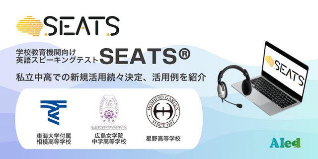 アイード株式会社(本社:東京都新宿区、代表取締役:窪田優希、以下「アイード」)は、アイードが提供する学校向けスピーキングテスト「SEATS(R)」が、東海大学付属相模高校、広島女学院高校、星野高等学校(五十音順)など、複数の私立中学校高校において活用が決定したことを発表いたします。利用目的は様々ですが、全国的に英語4技能重視の傾向が強まる中、公教育における英語スピーキングテスト需要が高まりを見せていると考えられます。