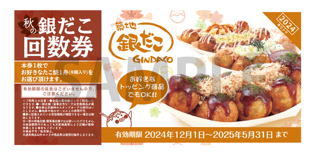 築地銀だこの “ぜったいお得な” 『秋の回数券』 は、お好きなたこ焼(8個入り)(*1) と引換え可能な回数券(1セット4枚入り、11枚入りの2種類)で、2024年12月1日から2025年5月31日まで全国の店舗 (*2) でご利用いただけます。
