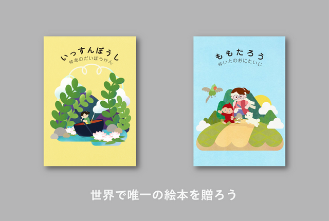 JibunEHON(じぶんえほん)とは、日本の昔話を可愛いくてPOPなイラストと共に、世界で唯一の絵本にして大切な方へ贈ることができるギフトサービスです。