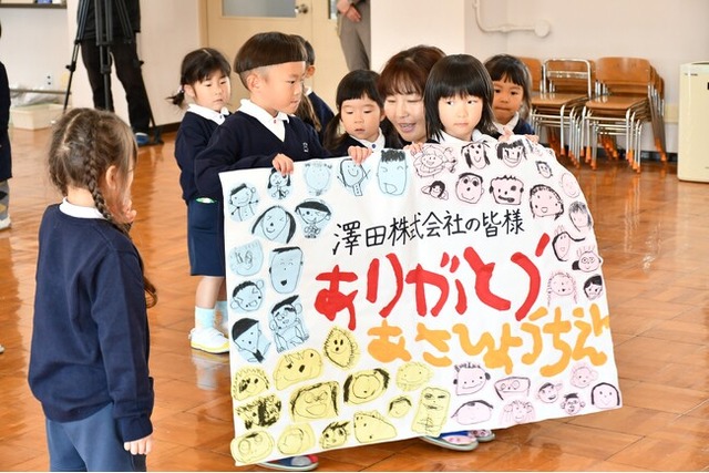 寄贈式では、澤田株式会社から園児へ直接寄贈品が手渡され、園児からは寄贈のお礼としてパフォーマンスの披露やメッセージカードが贈呈されました。