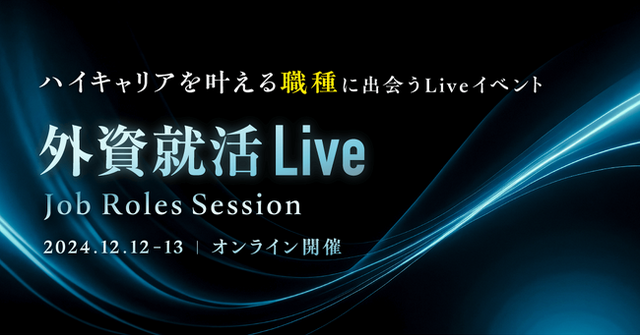 「世界で挑戦できる人材を育み、未来を創る」を掲げ、ユーザーファーストを追求したキャリアプラットフォーム「外資就活ドットコム」を運営する株式会社ハウテレビジョン(東京都港区、代表取締役:音成洋介)は、ハイクラスのキャリアを目指す学生を対象に、業界・職種研究のオンラインイベント「外資就活 Live Job Roles Session」を2024年12月12日(木)、13日(金)に初開催します。ハイキャリアを実現できる18職種について、コンサルティングファームや外資系投資銀行、総合商社など15社が登壇し、紹介します。