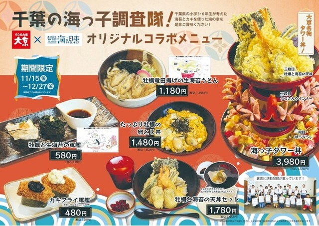 一般社団法人海と日本プロジェクトin千葉県は、千葉県内を中心に家族向け和風レストランを展開する株式会社大京(本社:千葉県印旛郡酒々井町)の協力のもと、「海苔」や「カキ」を使った海と日本プロジェクトとのコラボメニューを2024年11月15日(金)から12月27日(金)の期間限定で「すしめん処 大京」(千葉県内9店舗、茨城県内1店舗、群馬県内2店舗)にて販売します。この企画は、次世代へ豊かで美しい海を引き継ぐために、海を介して人と人とがつながる“日本財団「海と日本プロジェクト」”の一環です。
