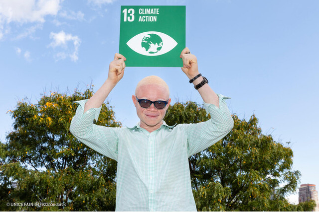 国連本部前でSDGsの目標13「気候変動に具体的な対策を」のアイコンを掲げる、コンゴ民主共和国出身のエマニュエルさん(米国、2024年9月20日撮影) (C) UNICEF/UNI647922/Znidarcic