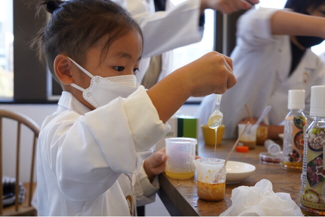 クイズ形式で楽しく知識を深め、実際にごま油を搾る難しさを体験し「ものづくり」の大変さを学びます。オリジナルたれ作りでは、「注射器」や「ビーカー」を駆使して自分だけのレシピを研究開発し、ラボの仲間にプレゼン、試食まで実施します。