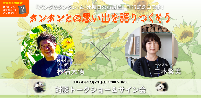 『パンダのタンタン 二人の飼育員との約束』&『水曜日のお嬢様 タンタンのゆるゆるライフ』の刊行を記念して、本書の著者であるNHK「ごろごろパンダ日記」の番組プロデューサー杉浦大悟氏と、人気WEB 連載「水曜日のお嬢様」著者の二木繁美氏の対談トークショー&サイン会を開催いたします!
