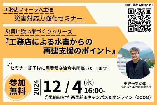 一般社団法人工務店フォーラム主催の「災害に強い家づくり」シリーズは、地域工務店が災害対応力を高めるための具体的なノウハウを学べるセミナーです。今回は「水害からの再建支援」をテーマに、信州大学工学部建築学科の中谷岳史助教をお迎えし、災害に対する建築支援の実践的な取り組みについてお話しいただきます。また、終了後の交流会では、業界の仲間とつながる場も提供します。