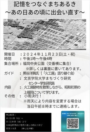 文京学院大学(学長:福井勉)まちづくり研究センターふじみ野は、ふじみ野市と共催でふじみ野市内にある「東京第一陸軍造兵廠川越製造所(通称火工廠)」の跡地をめぐり、戦争の記憶を辿るまちあるき企画「記憶をつなぐまちあるき~あの日 あの頃に出会い直す~」を2024年11月23日(土・祝)に開催することをお知らせします。