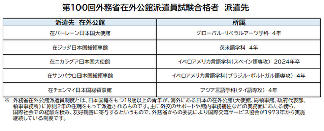 神田外語グループ(東京都千代田区/理事長 佐野元泰)は、第100回外務省在外公館派遣員試験(一次試験:外国語・教養・作文・適正検査/二次試験:外国語と日本語の面接)において、神田外語大学(千葉市美浜区/学長 宮内孝久)から5人の合格者を輩出しました。本グループは、これまで88カ国250人の学生・卒業生を外務省在外公館派遣員として輩出しています。派遣員は、原則2年の任期の中、これまでに学んだ外国語を生かし、その国で外交支援業務に携わる稀少な経験を積みます。任期を終了した本学の学生・卒業生は、外務省、地方自治体、大手企業などへの就職をはじめ、国内外の大学院に進学するなど、より視野と選択肢を広げながら世界で活躍しています。