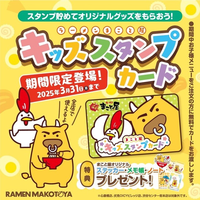 2024年11月15日(金)~2025年3月31日(月)の期間、お子様メニューを注文いただいた方に『キッズスタンプカード』を無料でお渡しし、集めたラーメンシールの数に応じて『ラーメンまこと屋オリジナルグッズ』をプレゼント致します。