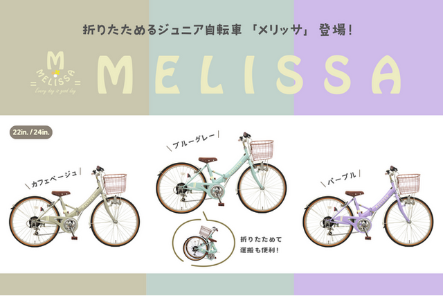 「MELISSA(メリッサ)」は、機能だけでなく “おしゃれ”も詰め込んだガールズ向けの折りたたみ式自転車です。自転車でのお出かけが楽しくなるように、ファッション性のあるデザインにこだわりました。