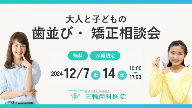 特にお子さまの矯正治療は、将来的な抜歯のリスクを減らせるメリットもあります。矯正治療を検討されている方はぜひこの機会にご相談ください。各日24組限定、先着予約制となります。