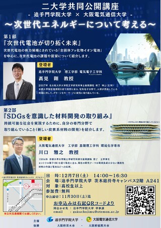 こうした中、2つの大学と茨木市、寝屋川市が連携し、「次世代エネルギー」をテーマに、現在の技術開発の現状や課題、その展望を知っていただき、関心を深めてもらう機会として、地域の市民を対象にした公開講座を開催します。