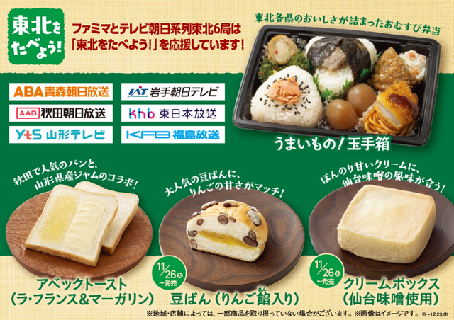 このたび発売する4商品は地域で親しまれているメニューや、地場の食材を取り入れ、玉手箱に見立てた6県の美味しい食材を詰めこんだおむすび弁当や、秋田県の「アベックトースト」と山形県の「ラ・フランス」、岩手県の「豆ぱん」と青森県の「りんご」、福島県の「クリームボックス」と宮城県の「仙台味噌」などのご当地パンと地元食材をかけあわせたパン全3種類を発売いたします。
