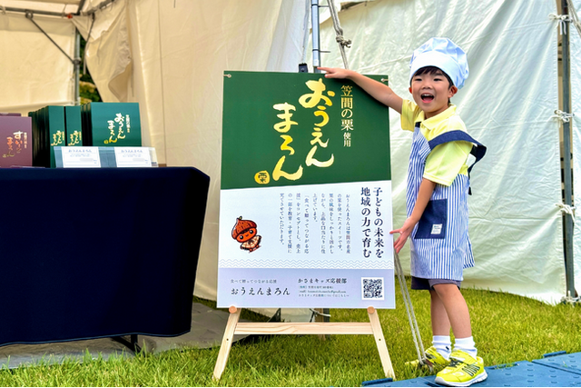 茨城県笠間市は日本有数の栗の産地で、作付面積は日本一を誇り、高品質な栗が豊富に収穫されています。この笠間産の栗を贅沢に使用した焼き菓子『すいーとまろん』が、第一弾プロジェクト『おうえんまろん』の中心となる応援アイテムです。『すいーとまろん』は、第三回茨城おみやげ大賞を受賞した逸品で、ペースト状の栗にブランデーや砂糖を練り込み、ひとくちサイズに焼き上げた上品な焼き菓子です。製造は、茨城県笠間市の農業生産法人・有限会社ナガタフーズが担当しており、かさまキッズ応援部はこの『おうえんまろん』を販売することで地域の教育支援や子育て支援を実現します。