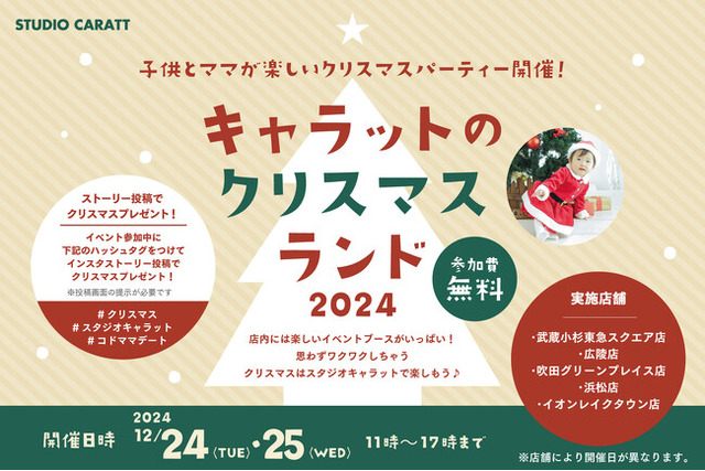株式会社キャラット(本社:奈良県香芝市、代表取締役社長:佐野 隆之)が運営するフォトスタジオ「スタジオキャラット」は、2024年12月24日(火)、25日(水)の2日間限定でクリスマスイベント「キャラットのクリスマスランド」を開催します。対象となる5店舗にて、各店舗先着50組限定のサンタさんとの記念撮影やクリスマス用ヘアメイク体験会など、お子様もママもご家族も楽しめるイベントを実施します。