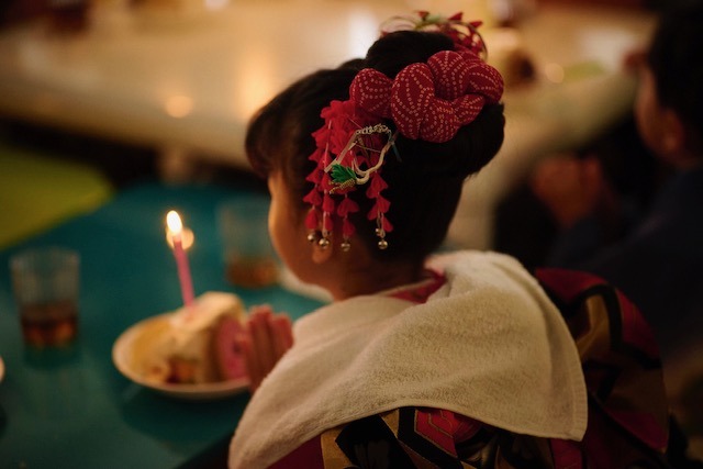 綺麗に着付けとヘアメイクをされた男女8名の子供たちも最初は緊張していましたが、施設内での参拝・記念撮影後に、自分たちの名前が入ったプレート付きのサプライズケーキを見た瞬間、溢れんばかりの笑顔になり、一斉にろうそくで炎を吹き消すと拍手喝さいの中、歓声に包まれ、大喜びでした。