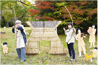 各ポイントでは、文化財ボランティアガイドによる解説があります。また、火起こしや貫頭衣(昔の衣装)の体験コーナー、狩りや発掘の疑似体験コーナー、植物の繊維で編んだ古代の布を復元展示したコーナーもあります。