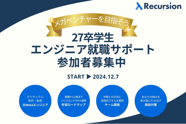 Recursion, Inc(共同創業者:田島慎也、Jeffry Alvarado、本社:アメリカカリフォルニア州)が運営するコンピュータサイエンス学習サイト「Recursion」は、2027年卒業予定の学生を対象にメガベンチャーでのインターン・内定獲得を目指すための「エンジニア就職サポート」の参加者募集を開始いたしました。このプログラムは、元Metaエンジニア作成のカリキュラムでバックエンドエンジニアとしてのスキルを効率よく身に付け、同じ志を持つ仲間と成長し合いながら、希望する企業への就職を目指す方を全面的にサポートするものです。