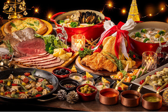 クリスマスのご馳走をイメージした華やかな料理が並びます。さらに、12月21日(土)~25日(水)の5日間は、牛ステーキ(ランチ)やオマール海老のソテー(ディナー)など、臨場感あるライブキッチンで仕上げる特別料理も登場。