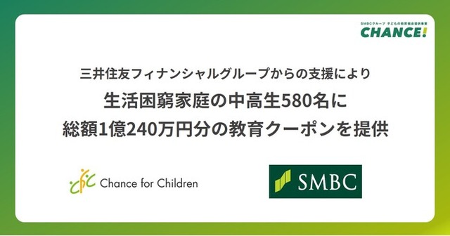 公益社団法人チャンス・フォー・チルドレン(東京都墨田区、代表者:今井悠介・奥野慧、以下「CFC」)は、株式会社三井住友フィナンシャルグループ(東京都千代田区、執行役社長グループ CEO:中島達、以下グループを総称して「SMBCグループ」)の資金を原資に、生活困窮家庭の中学2・3年生および高校2・3年生580名に対して、総額1億240万円分の「SMBCグループ・スタディクーポン」を提供いたしました。スタディクーポンは、提携する学習塾や習い事等の費用として利用可能です。