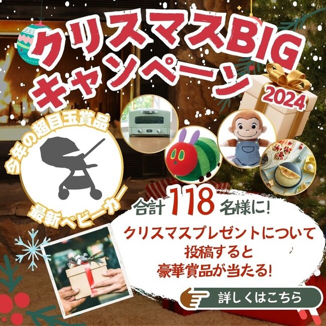 ・目玉賞品のご紹介:今年の「クリスマスBIGキャンペーン2024」超目玉賞品は、アップリカ(ニューウェルブランズ・ジャパン合同会社)からの、冬の新商品ベビーカーをプレゼント!12月2日(月)に発表の商品なので追加の情報をお楽しみに!!(11月15日(金)から先行して、プレゼントに選択できます!)