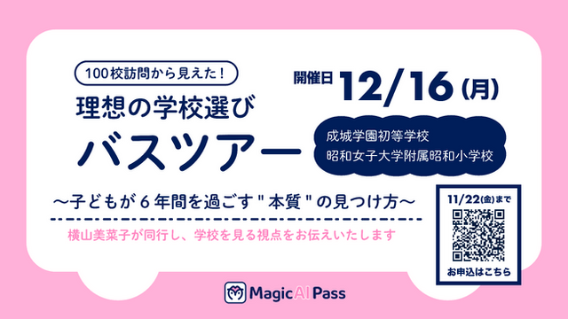 株式会社MagicAlPass(本社:東京都目黒区、代表取締役社長:高木 秀)は、2024年12月16日、完全無料の小学校受験応援メディア「マジナビ」特別企画として、編集長であり100校の小学校訪問の経験者、初等教育ナビゲーターの横山美菜子と行く「理想の学校選びバスツアー」を開催いたします。