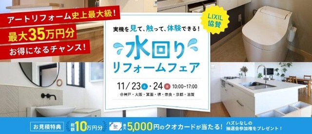 全国でリフォーム・リノベーション工事を年間6,500件以上手がける株式会社アートリフォーム(本社:大阪府吹田市、代表者:代表取締役社長 大本哲也、以下「アートリフォーム」)は、2024年11月23日(土)~24日(日)にかけて、LIXILショールーム大阪(グランフロント大阪)はじめ関西の7ショールームで「水回りリフォームフェア」を同時開催します。