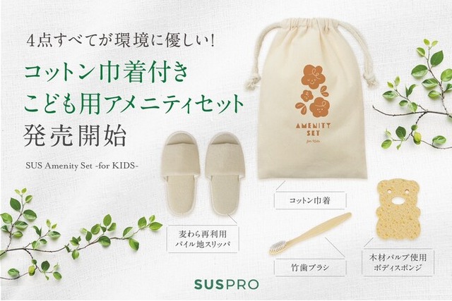 オリジナルグッズを企画製造するアイグッズ株式会社(本社:東京都渋谷区)は、エコアメニティを展開するSUS amenity(サスアメニティ)ブランドより、『SUS Amenity Set -for KIDS-(コットン巾着付き こども用アメニティセット)』を、ホテル・旅館向けに、11月末より発売開始します。アメニティは、お子様用の小さめサイズの竹歯ブラシ・麦わら使用スリッパ・木材パルプ使用ボディスポンジの3種が同封されており、巾着も含めすべてが環境に配慮したセットになっています。