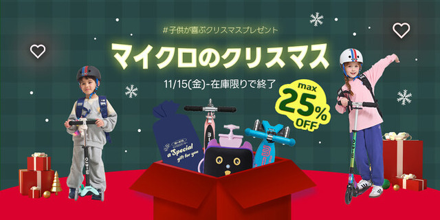2024年11月15日(金)から開催される「マイクロのクリスマス」は、クリスマスシーズンに向けて人気商品の3輪キックボードのマキシやミニ、2輪キックボードのスプライトなどを含む対象商品が最大25%OFFとなっております。収納が楽に出来、移動に便利な折りたたみモデルもイベント対象となっており、子ども達に喜んでもらえるような豊富なラインナップとなっております。