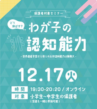 株式会社 学研ホールディングス(東京・品川/代表取締役社長:宮原博昭)のグループ会社、株式会社 学研スタディエ(さいたま市/代表取締役社長:亀谷眞宏)は、2024年12月17日に、『どう伸ばす? わが子の非認知能力ー世界遺産学習から得られる非認知能力は無限大ー』と題した保護者対象セミナーを開催いたします。