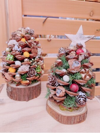 たオリジナルのクリスマスミニツリー。常緑樹の葉や実、オーナメントを自由にあしらい、世界にひとつだけの作品がつくれます。また、土台なしでツリー部分にオーナメントを吊るしたアレンジも可能です。小学生のお子さまでも楽しく簡単にお作りいただけますので、親子でのご参加も大歓迎です。五感を使って楽しむワクワクのひととき、素材の自由な組み合わせで、みんながアーティストになれる時間をお楽しみください。手ぶらでご参加いただけます。