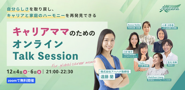 「私である、ママである、妻である――やりたいこと全部やりたい」そんな女性を応援するオンラインTalk Sessionが開催されます。家事、育児、仕事――すべての役割を全力でこなす女性たちが抱える「罪悪感」「迷い」「自信喪失」。このような悩みを持つキャリアママたちのために、株式会社アハハナが主催するオンラインイベント「For Global Career Moms」が開催されます。今回のイベントは、Zoomを活用した完全オンライン形式で実施される無料参加型です。エントリーは先着順です。