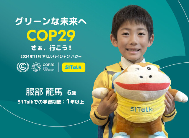 世界最大級のオンライン英語学習プラットフォームを提供する51トーク・オンライン・エデュケーション・グループ(本社:シンガポール、代表:Jiajia Huang)の日本法人である株式会社51Talk Japan(本社:東京都港区、代表:服部慶)では、当社サービスの受講生である小学1年生の服部龍馬さん(6歳)が、2024年11月11日からアゼルバイジャンの首都バクーで開催される気候変動枠組条約締約国会議(COP)※1 の「子どもと若者」をテーマとする部会(Youth in action, speak the future of the world)において、スピーチする予定です。その時間が日本時間11月20日(水)19時(現地時間 同日14時)に決定されました。また、スピーチの様子は、当社YouTube公式ページで配信されます。(COP29 Azerbaijanページでの配信も予定)