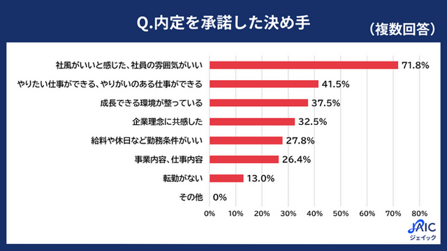 「内定を承諾した決め手(理由)は何ですか?当てはまるものをすべて選択してください」と質問したところ、「社風がいいと感じた、社員の雰囲気がいい」が71.8%、「やりたい仕事ができる、やりがいのある仕事ができる」が41.5%、「成長できる環境が整っている」が37.5%、「企業理念に共感した」が32.5%、「給料や休日など勤務条件がいい」が27.8%、「事業内容、仕事内容」が26.4%、「転勤がない」が13.0%、「その他」が0%となりました。