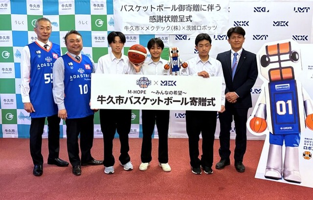 NOK株式会社のグループ会社であるメクテック株式会社(本社:東京都港区芝大門、代表取締役社長執行役員 CEO:伊藤 太郎、以下「メクテック」)は、2024年9月に、B1リーグ所属のプロバスケットボールチーム「茨城ロボッツ」(株式会社茨城ロボッツ・スポーツエンターテインメント、本社:茨城県水戸市、代表取締役社長 川崎 篤之)とのパートナーシップ契約を締結しました。このパートナーシップを機に、地域貢献活動の一環として同チームと連携し、茨城県牛久市の全中学校にバスケットボールの寄贈を決定、11月18日(月)に寄贈式を牛久シャトーで開催しました。