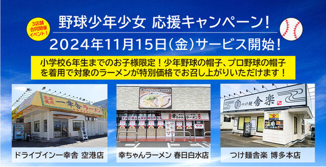 世界11カ国90店舗以上を展開、ラーメンのグローバルブランド、博多一幸舎や幸ちゃんラーメンを運営する、株式会社ウインズジャパンホールディングス(所在地 福岡県福岡市博多区、代表取締役社長 吉村 幸助 以下当社)は、博多一幸舎ブランド「ドライブイン一幸舎空港店」と、同社がプロデュースする「幸ちゃんラーメン春日白水店」「つけ麺舎楽博多本店」の3店舗限定で博多豚骨ラーメンやつけ麺が特別価格でお召し上がりいただける「野球少年少女応援キャンペーン」合同イベントを開始いたしました。本企画は、野球好きの店長たちから生まれ、すでにドライブイン一幸舎空港店では定例で開催しており、お子様をはじめ、親御さんからも「美味しラーメンをお得に食べられる!」と大変好評いただいていいます。そのため、もっとたくさんの方に本イベントでお食事を楽しんでいただきたいという思いから、この度、駐車場併設の大型店舗である「幸ちゃんラーメン春日白水店」「つけ麺舎楽博多本店」にて実施する運びとなりました。お車も停めやすい店舗ですので、ご家族やご友人たちとご一緒にワイワイ!楽しい時間を自慢のラーメン、つけ麺を食べながらお過ごしください!