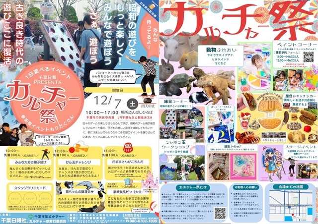 株式会社千葉日報社(千葉市中央区、中元広之社長)は12月7日、千葉市中央区中央港の「さんばしひろば」で、さまざまな文化や遊びを体験できるイベント「千葉カルチャー・フェスティバル(カルチャー祭)」を開催します。