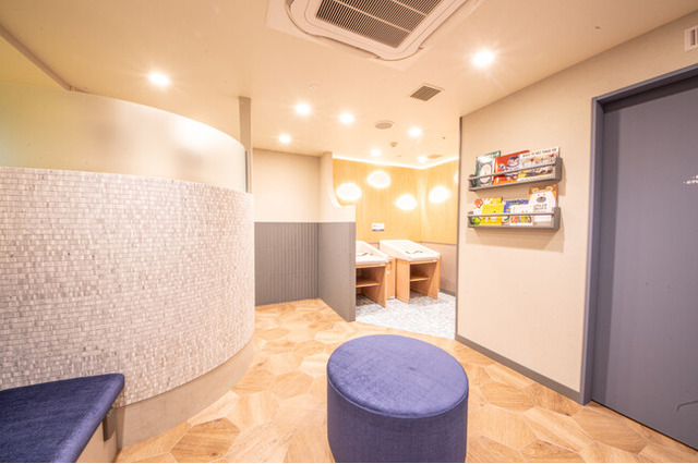 塗り壁、タイル、木リブなど、自然素材をメインに使用した空間構成。柔らかい色調で、まるでおうちのリビングにいるかのような安心感を演出。また、壁に雲の形をしたオリジナルの間接照明を複数配置。これは、空や雲を連想させ、子供たちの想像力を刺激するとともに、おしゃれで温かみのある親子での特別な時間をより豊かにします。雲のモチーフに加え、床のデザインも自然を連想させるような模様、おむつ台の床材の柄は北欧の湖畔の小石をイメージしております。