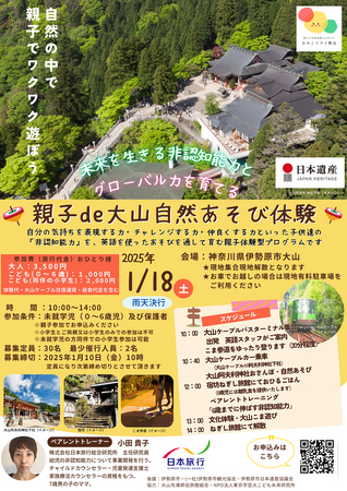 株式会社日本旅行(本社:東京都中央区、代表取締役社長:小谷野悦光)は、地域での自然体験や文化体験を通して乳幼児の「非認知能力」*を育むプログラムを開発し、親子で参加する実証ツアーとしての旅行商品「未来を生きる非認知能力とグローバル力を育てる!親子de大山自然あそび体験」を11月19日(火)より発売します。