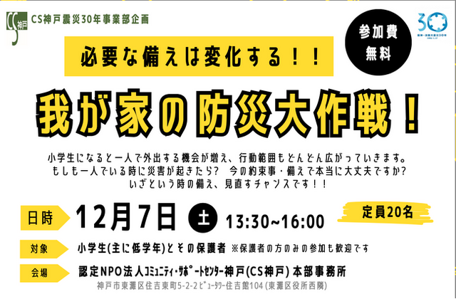 認定NPO法人コミュニティ・サポートセンター神戸(CS神戸)は、阪神・淡路大震災を契機に、「自立と共生」を理念とした地域社会をめざし、自ら活動する人々を応援する民設民営のサポートセンターです。共生循環型のまちづくりやNPO手法によるコミュニティ事業を行う団体の立ち上げや運営を支援しています。 震災30年の節目を迎え、立ち上げから支援している活動団体にエールを送ると共に、改めて防災について家族の中で考える機会を作り、大切さを伝えたいと考え企画しました。防災について一緒に学び、地域課題の解決するために活動している団体を身近に感じていただければ幸いです。