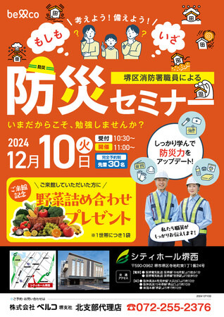 人生の二大行事である「冠婚葬祭」を、互助会という助け合い事業を通じて、お手伝いしてきた株式会社ベルコ(本社:大阪府池田市、代表取締役社長:齋藤 斎、以下「ベルコ」)は、2024年12月4日(水)シティホール堺と12月10日(火)シティホール堺西の2会場にて「堺区消防職員による防災セミナー」を開催いたします。いつ来るかわからない「大震災」に対して、同エリアの現役消防職員により講師にお越しいただき、防災セミナーを開催いたします。