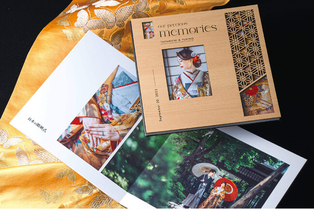 表紙にはお気に入りの写真が入れられるほか、着用した花嫁衣裳に使われている柄や文様でデザインできるのが特徴。こだわって選んだ一着の思い出を鮮やかに残せます。