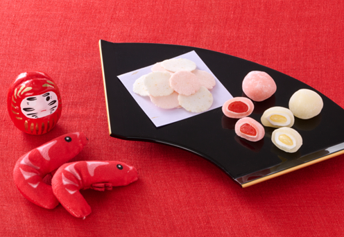 縁起の良いダルマを全面にだしたパッケージデザインでもちもちとした食感の「ちいさな紅白大福」と、お守りをイメージしたパッケージデザインで赤色と白色のえびせんをミックスさせた「紅白えびせん」の2商品です。