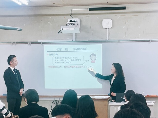 土岐プレミアム・アウトレットでカスタマーサービスを担当している、マネージャーの五十川麻希子と、日本ショッピングセンター協会の主催する接客ロールプレイングコンテストにおいて、第29回大賞を受賞し、日本一となった遠藤公志郎さん(「Ryu」 店長)による接客授業を、マーケティングコース2年生41名と3年生32名の生徒を対象に、それぞれ50分間行いました。