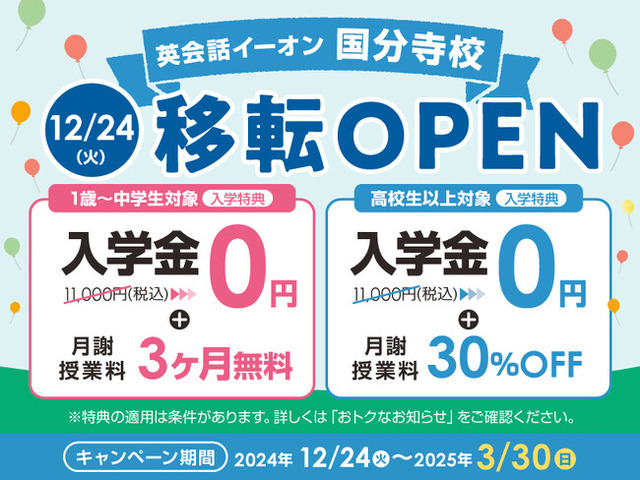英会話教室を運営する株式会社イーオン(本社:東京都新宿区、代表取締役社長:重野卓、以下「イーオン」)は、2024年12月24日にイーオン国分寺校を移転オープンいたします。