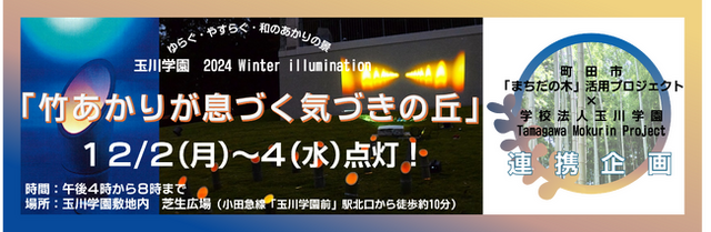 この度、町田市と学校法人玉川学園が連携し、小野路地域の竹林整備で発生した竹を使った竹あかりを同法人が実施するWinter Illumination「竹あかりが息づく気づきの丘」に出展します。このイルミネーション演出企画は、玉川学園 Tamagawa Mokurin Project と玉川大学学術研究所(田中敬一特別研究員)により、景観阻害や生態系への影響など社会問題化している放置竹林の再生と活用をテーマに実施するものです。