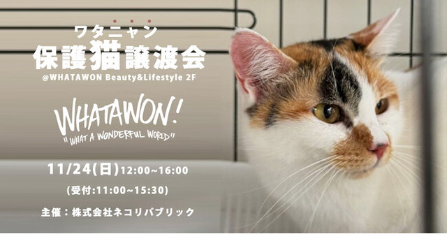 株式会社ネコリパブリック(@necorepublic_campaign)が主催する「ワタニャン保護猫譲渡会atWHATAWON」の開催が決定しました!2024年11月24日(日)12時から16時まで、ワタワン BEAUTY&LIFESTYLE 2Fにて、保護猫たちが新しい家族との出会いを待っています!譲渡会では、子猫や成猫のふれあいコーナーやネコリパブリックオリジナルグッズの販売も行われます。猫を家族に迎えたい方や、猫好きな方はぜひお越しください。譲渡には審査があり、当日連れて帰ることはできませんが、未来の家族との素敵な出会いを見つけられる機会です!